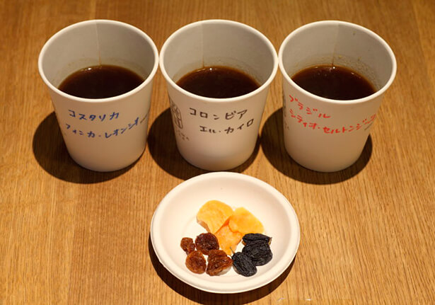 コーヒーは左から、「2015年コスタリカCOE1位 フィンカ・レオンシオ(左から審査年、国、COE順位、農園。以下同)」「2014年コロンビア・サウスCOE2位 エル・カイロ」「ブラジル・ナチュラルCOE2位シティオ・セントルジーニョ」。