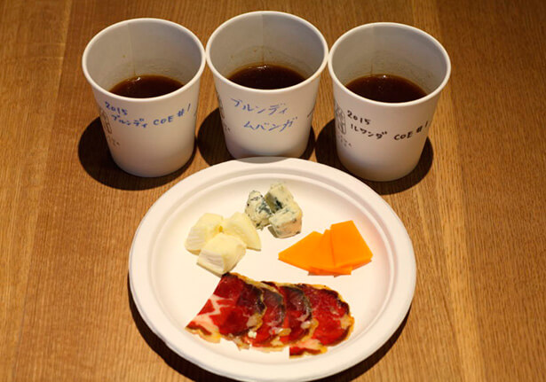 高品質な豆が増えたことで、コーヒーは、まるでワインのようにマリアージュを楽しめる飲み物として、関心が高まっています。 この会の趣旨でもある「コーヒーと食とのマッチング」。丸山珈琲の全面協力を得て、COEで入賞したスペシャルティコーヒーと食材とのマッチングを参加者に体験していただきました。 食材は、ドライフルーツ、チーズ、シャルキュトリー。いずれもワインなどのお酒に合う食材ですが、はたしてどんなコーヒーと合うのでしょうか。実際のマッチングをご覧いただきましょう。