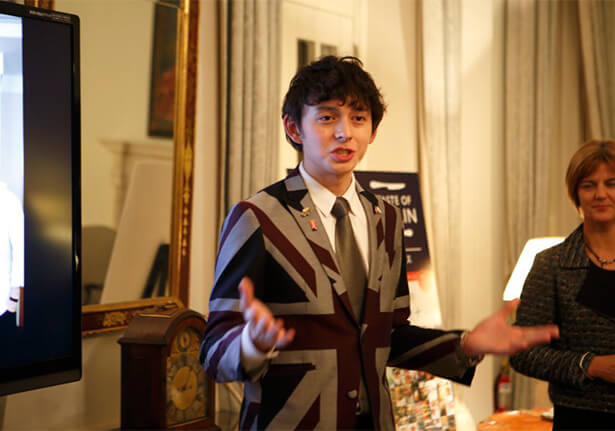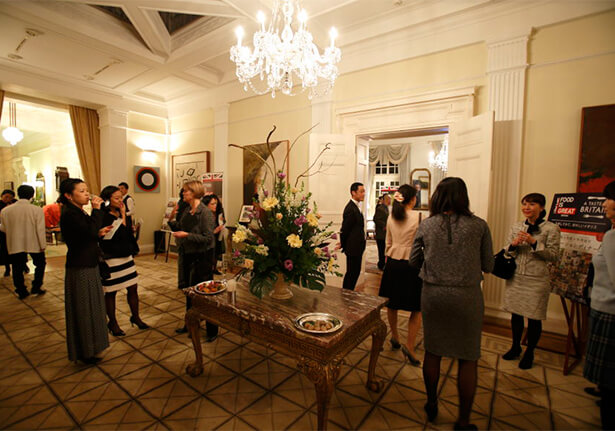 会場となる大使公邸に少し緊張した面持ちで現れた当選者の皆さんを、ウェルカム・ドリンク&カナッペで歓迎。大使館の食の親善大使を務めるハリー杉山氏による最新のイギリス・ガストロノミー事情に耳を傾けながら、イングリッシュ・スパークリングワインとフィンガーフードを楽しみ、緊張もほぐれたところで、エレガントなダイニングルームへ。