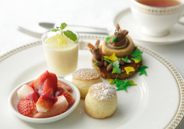 ふわっと軽やかな口当たりの温かいミニスコーンはレモンカード&クロテッドクリームのムースと共に。リスをかたどった細工菓子は秋のイギリスの公園をイメージ。