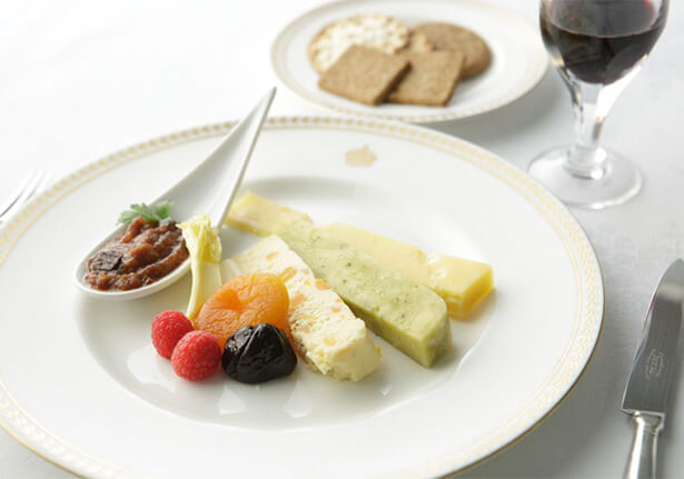 チーズのプレートはブラリアス・チェダー、アプリコット入りホワイトスティルトン、セージ・ダービーの3種。ベリーブラザース&ラッド社のセレクションポートが用意された。