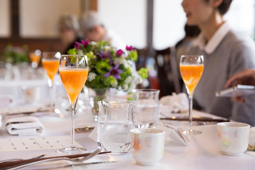 会場となったのは、うきは市吉井にある「町並み交流館 白花綜(しらかべ)」。吉井地区は江戸時代に豊後街道の宿場町としてにぎわい、今も風情ある白壁土蔵造りの町並みが大切に保存されています。その一角にある「白花綜」は、町家を使った交流スペース。太い柱や梁、漆喰の壁など、昭和3年建築当時のままの重厚な和の空間が、この日はモダンなレストランに。和と洋が溶け合う空間に参加者の皆さんの期待も高まります。