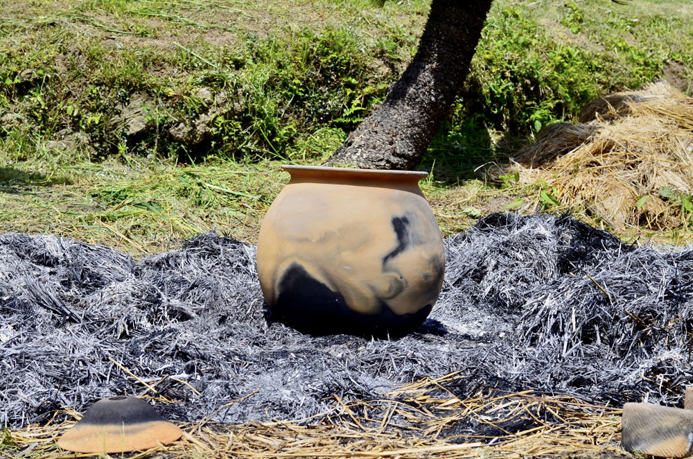 陶芸家・西山光太さんがクルックフィールズで採れた土を使い事前に製作した器を、クルックフィールズの麦藁で焼き上げ、土器にします。焼き上がった器を取り出すところを見学し、その器にランチを盛り付けます。