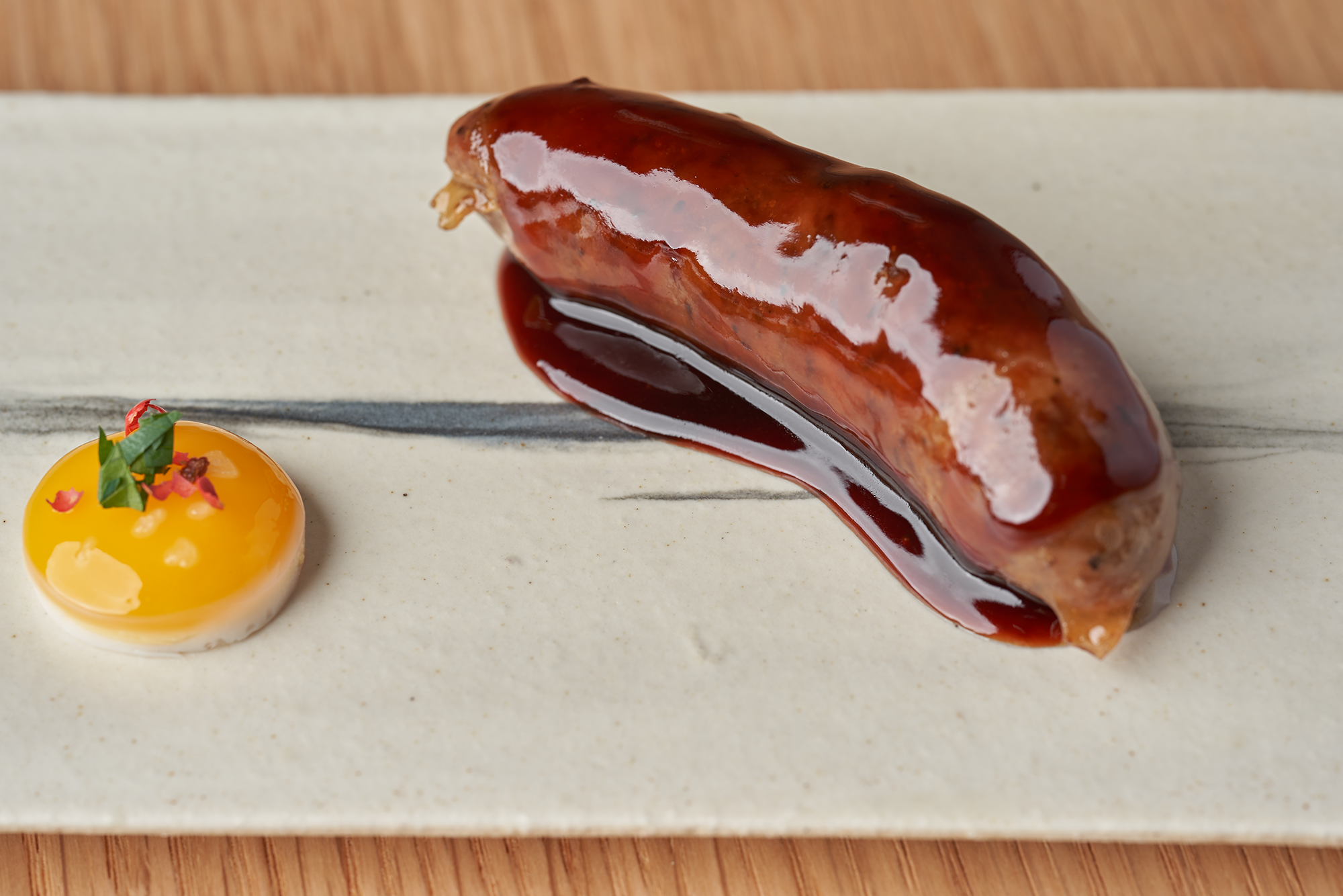 高知県産の「極みえのき」を主役に据え、その旨味や食感を存分に味わえるよう豚肉との配合を考えたオリジナルのソーセージ。半熟の目玉焼きと野菜の皮や端材でとる野菜のブイヨンソースを添えて。