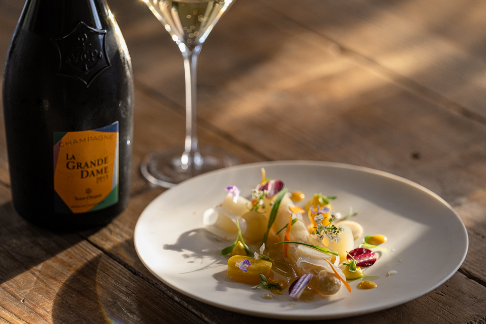 「ラ・グランダム 2015」はシャンパーニュ地方の「ラ・グランダム(偉大なる女性)」と呼ばれたマダム・ クリコへのオマージュを込めた1本。「とても繊細で、華やかなイメージ。今回は旬の食材であるホワイトアスパラを使用し、エチケットのようなカラフルな彩りも意識しました」とシェフ。至高のフードペアリングを是非ご体験ください。