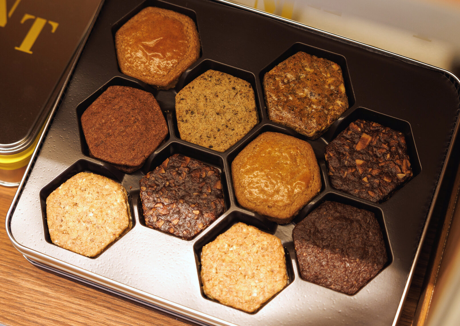 そして、六角形のビスキュイの詰め合わせ「ビスキュイ・エグザ」では小麦粉、トウモロコシ粉やそば粉、米粉など、穀物のもつ個性にフィーチャーしたフレーバー展開。グルテンの少ないそば粉と焙煎したトウモロコシ粉を掛け合わせ、ほろほろ崩れる食感の「サンポール」や、そば粉と韃靼そば茶の温かみのある香ばしさを重ねた「ビスキュイ・サラザン」、そのほかトウモロコシの胚乳を粗く粉砕したポレンタ粉や米粉に、様々なアプローチで香らせたバニラやショコラ、ナッツなどを組み合わせて展開している。
