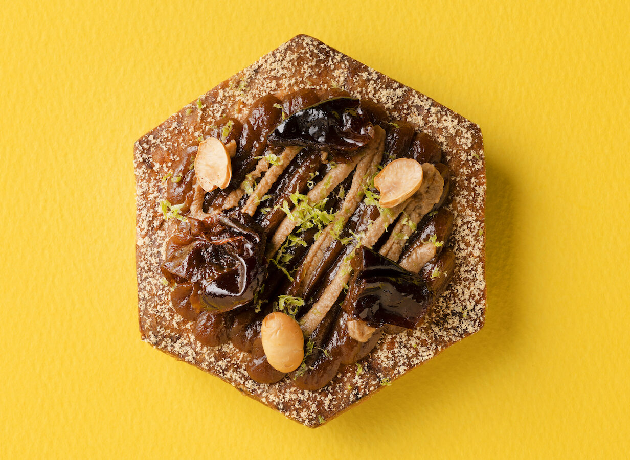 また、オーダーすると目の前でシェフがビスキュイの上にトッピングをして仕上げる「ビスキュイ・ミニュット」は、ケーキのようにビスキュイを楽しめる趣向だ。オープン記念の日本限定フレーバーでは、きなこや大豆、プルーンを混ぜ込んで焼き揚げた生地に、プルーンやきなこペーストや、プルーンのピュレ、煎り大豆などでデコレーション。