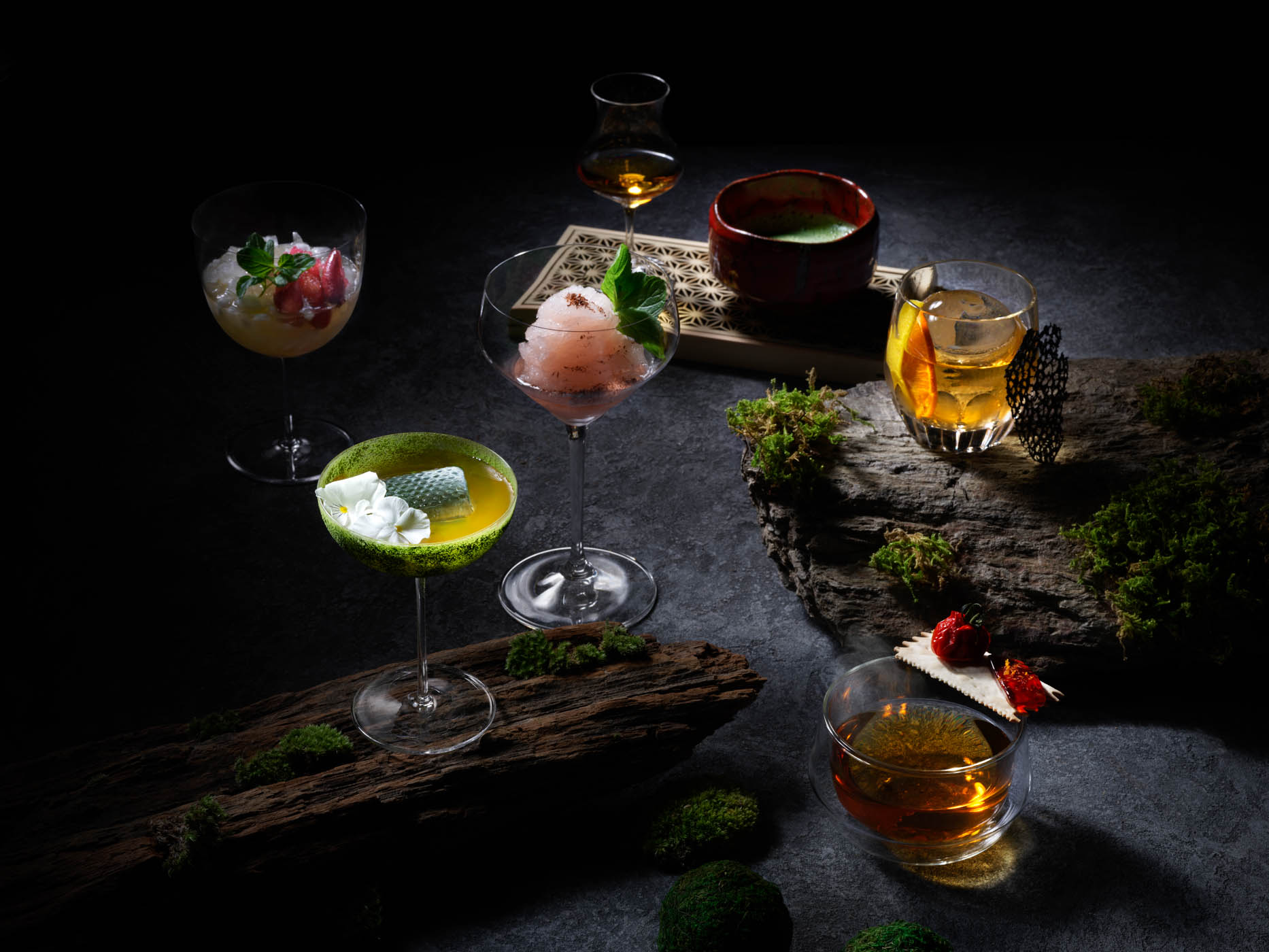 北海道の和ハッカ、淡路島のキャビアライム、和三盆を使った「北へ南へモヒート」。「西からのオールドファッションド」には石垣のバニラ、徳島の柚子、福岡の柑橘「はるか」を。福岡の希少なハチミツ、京都・宇治最古の茶園の抹茶を使った「ビーズ&ティー」など、ヘッドバーテンダーの和田健太郎氏とスタッフが選りすぐった食材、斬新な発想と技を用いて、日本独自のバーカルチャーを表現する珠玉のカクテルです。(各¥3,700、税・サービス料込)