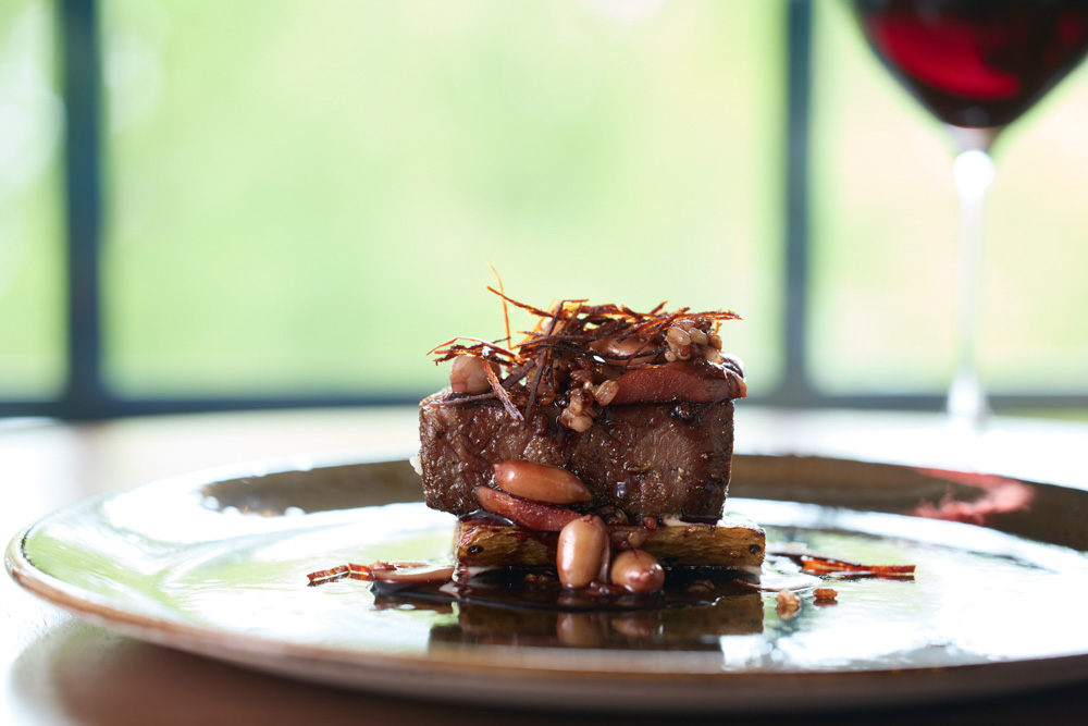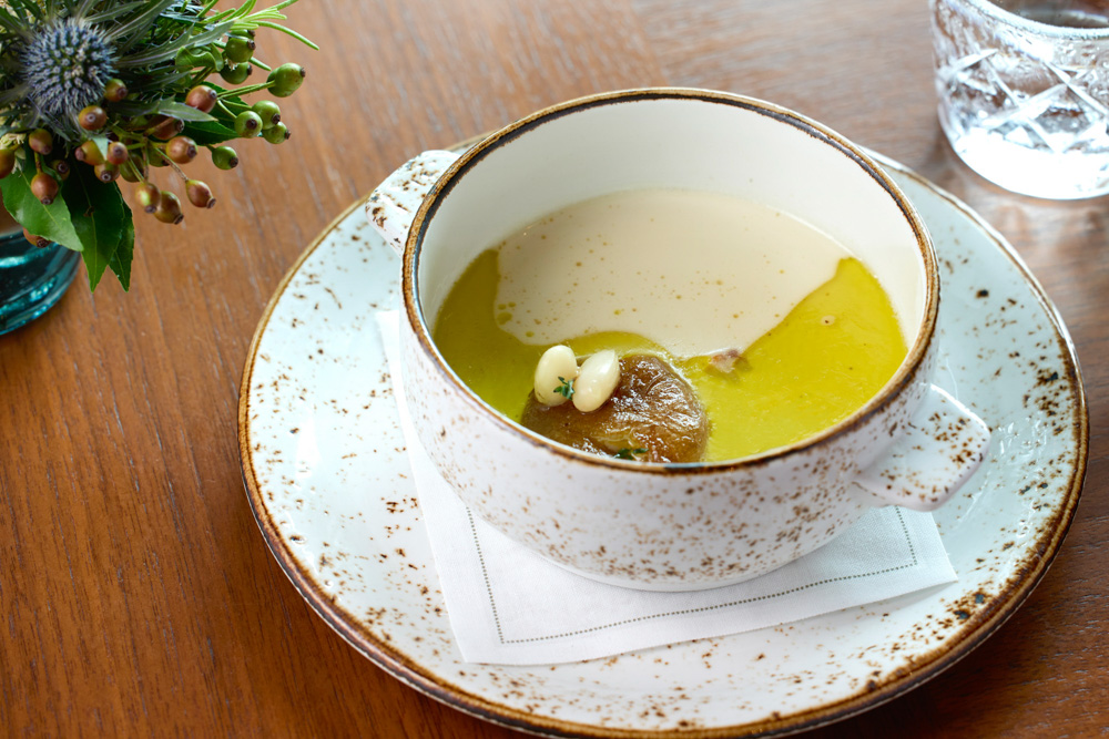 その時期にとれる栃木の野菜を主役にしたコースは、10月ならイモが主役となるが、皮ごと揚げて潰した舟石芋(在来種のジャガイモ)と白いんげん豆のスープ、熱々のさつまいものグラタンとセロリ、とちぎ霧降高原牛と長芋を使ったメインと、味わいも発想も飽きさせない。和歌山の自店ではほぼ目にすることのない、小林シェフの“ソース”を体験できるのも同レストランの魅力だろう。