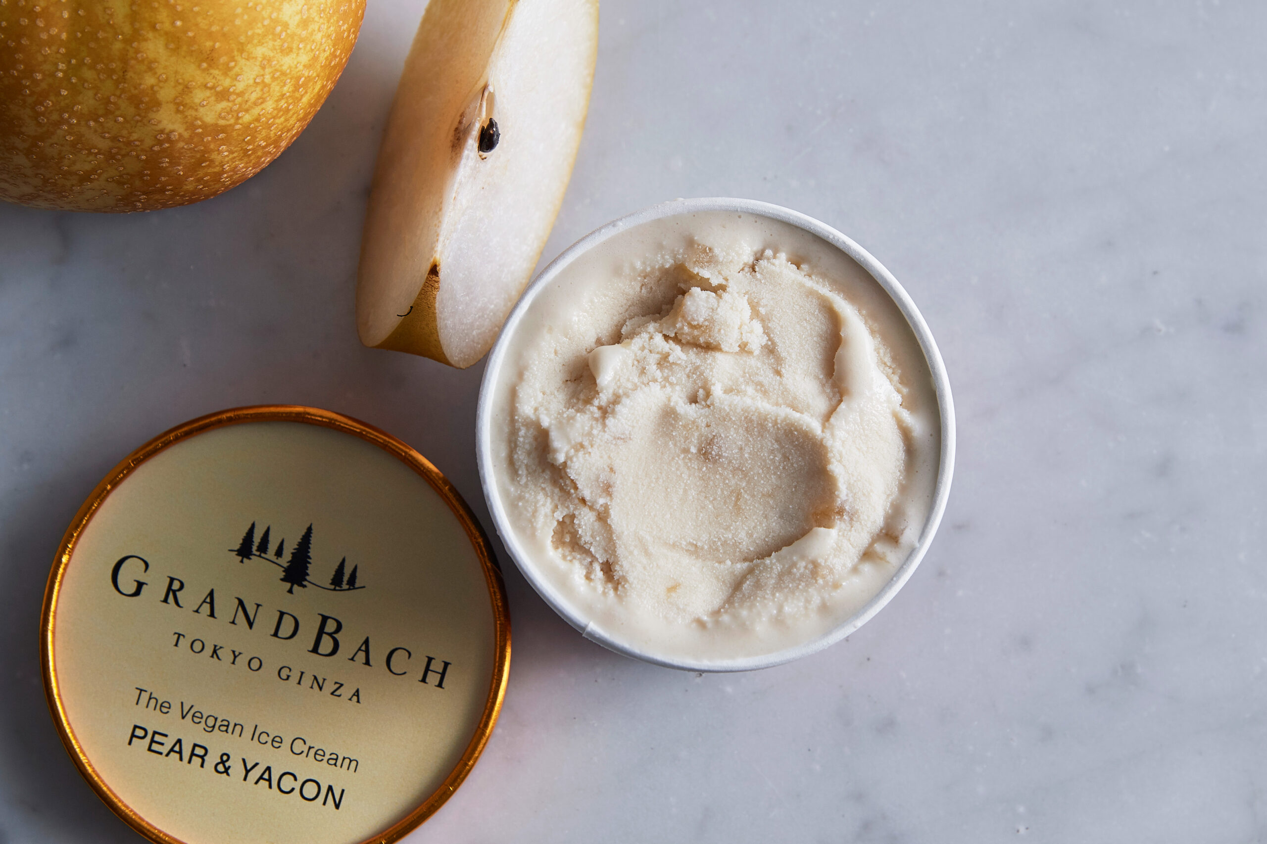 「The Vegan Ice Cream」のベースは有機豆乳や自然の素材でつくられており、「ナチュラルであること」の基本として、素材そのものの味わいと旨味を引き出したシンプルなフレーバーと、すっと口の中で溶ける軽くさっぱりとした食感が特徴。価格は1個¥810(税込)。ホテルグランバッハ東京銀座では、テイクアウトの他、レストランにてコース後のデザートとして、またアラカルトメニューとしても提供予定です。