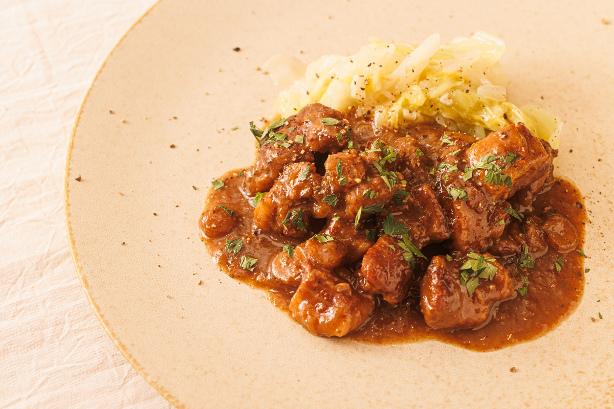 料理名:「多良木町産の猪肉とゴボウの煮込み キャベツのブレゼ」