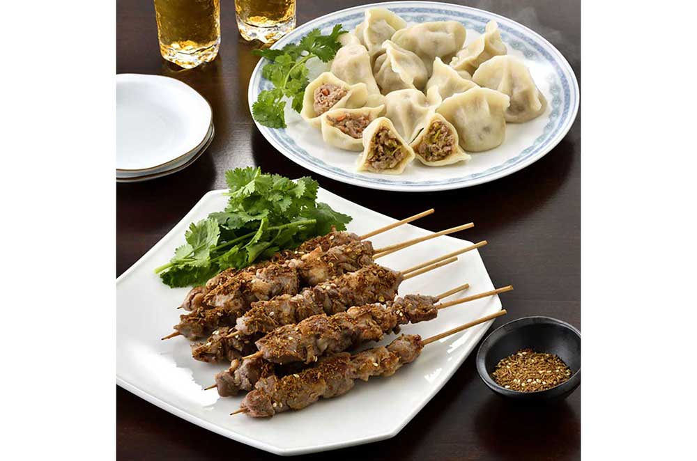 (写真)東京都・神田「味坊」の「羊肉串 10 本 水餃子 6 種 30 個」(¥4,860/税込)。中国東北部の郷土料理の味わいを家庭で楽しめる、文春マルシェオリジナルセット。