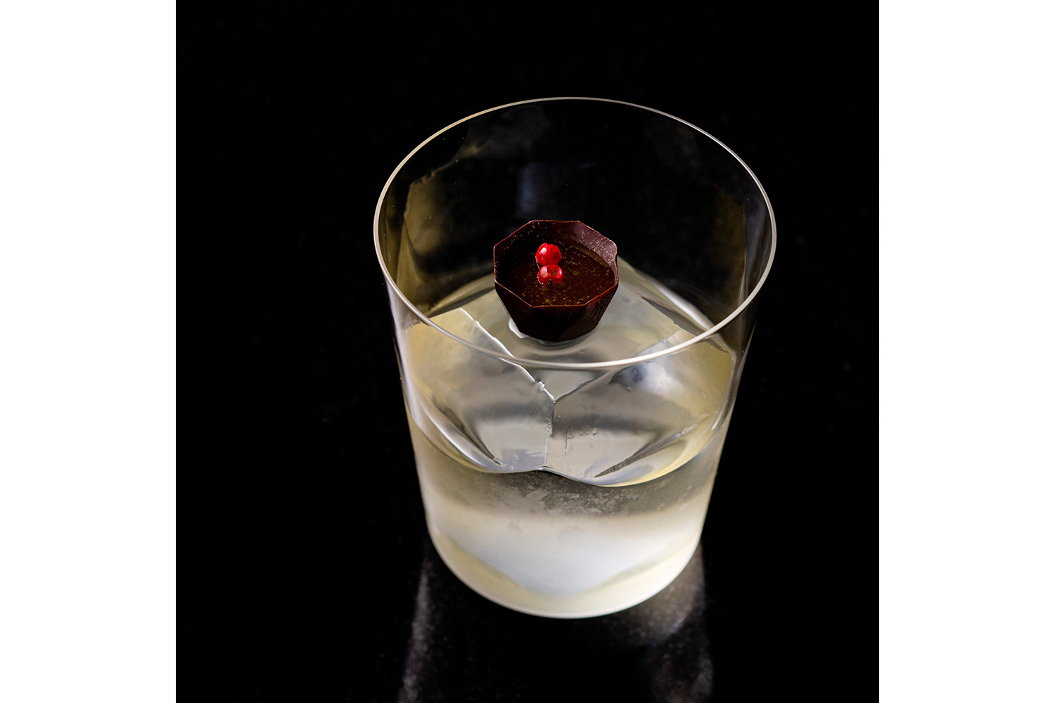 (写真)「Invisible Tiramisu(インヴィジブル・ティラミス)」・・・ティラミスの味わいを感じるのに、見た目は透明なウイスキーベースのカクテル。パッションフルーツチョコレートを食べた後に飲むと味わいが変化する。