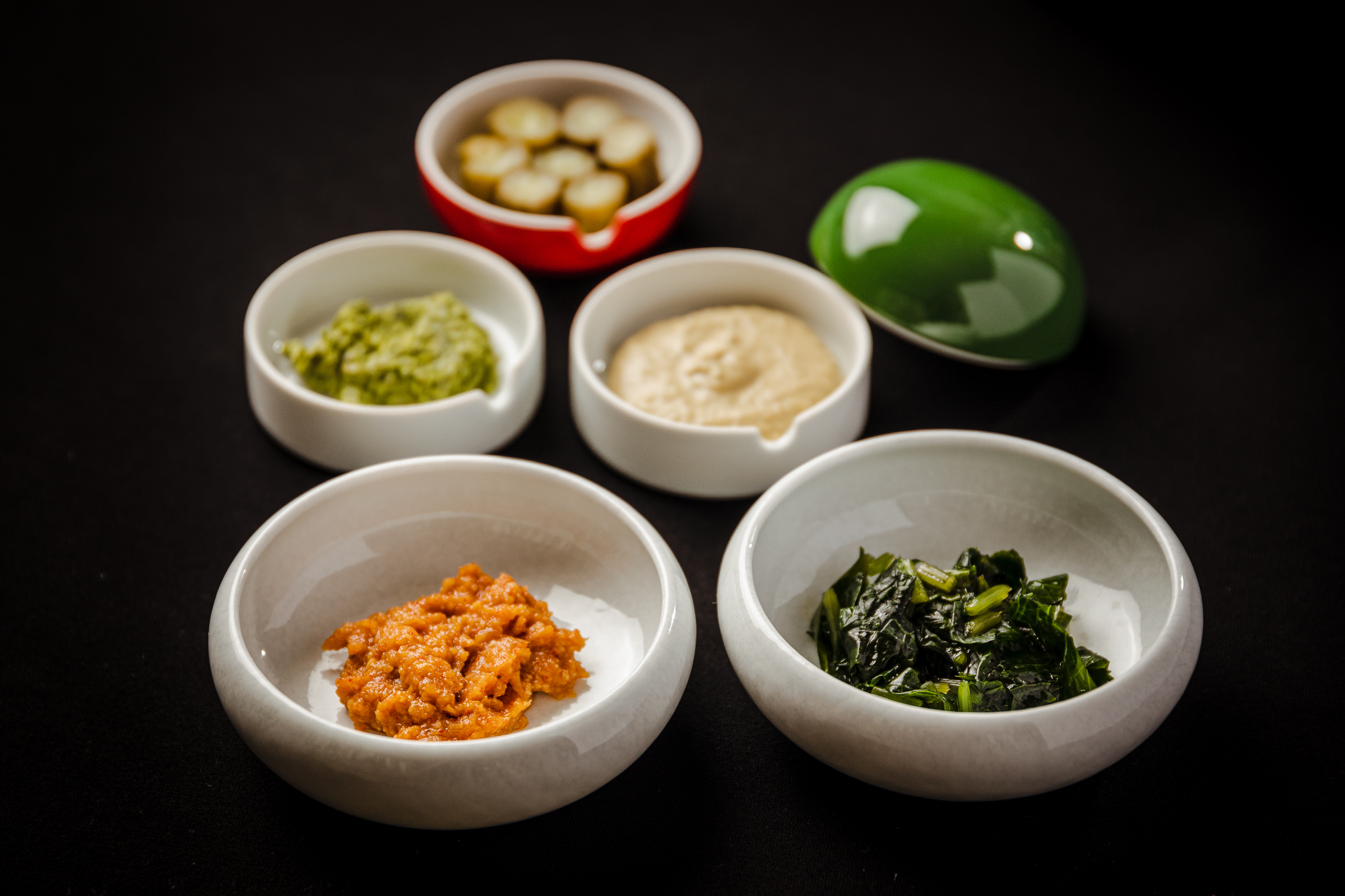 オリジナルの薬味には、安曇野の「藤屋わさび農園」の葉わさびや、文政四年創業の信州味噌醸造元「大桂(だいけい)商店」の味噌、京都府宮津の「飯尾醸造」の純米富士酢、「やまつ辻田」の国産純粋種「堺鷹の爪」など、シェフが選んだ日本伝統の素材や調味料を使用。
