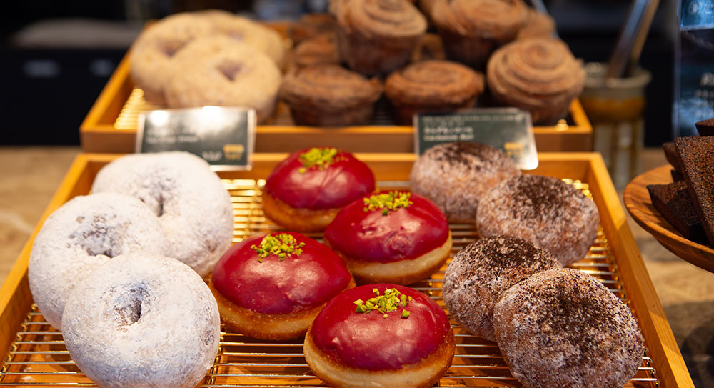 ベーカーとパティシエが生み出す限定スイーツが都内初登場。フルーツをぜいたくに使った果実味溢れる「ルバーブ&ストロベリークリームパイ」や自家焙煎コーヒーを練り込んだコーヒーカヌレ、店内で揚げるドーナッツ、コーヒーソフトなど、スイーツメニューも必見。