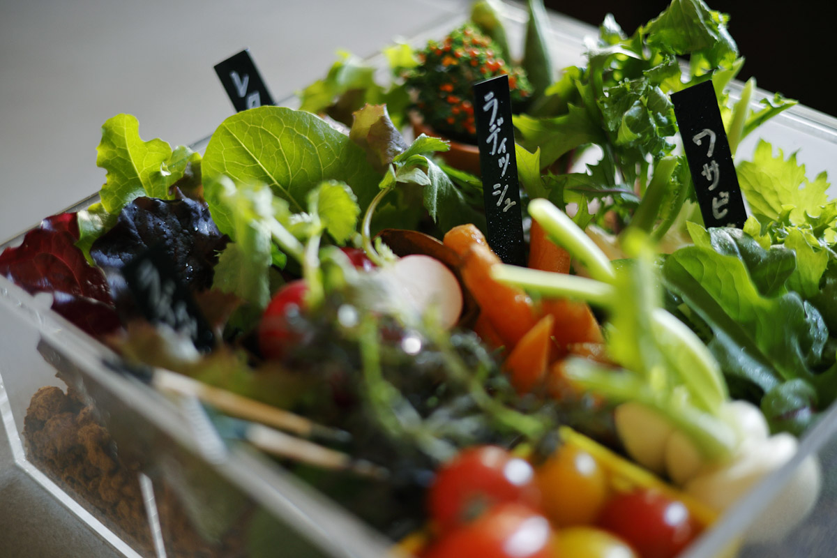 夕食時、店内中央のカウンターに登場するのは農園をイメージした「サラダブッフェ」。ドレッシングは米澤文雄氏のレシピで、オニオン、シーザー、ノンオイルのメープルヨーグルトの3種が登場(日により変わることがあります)。
