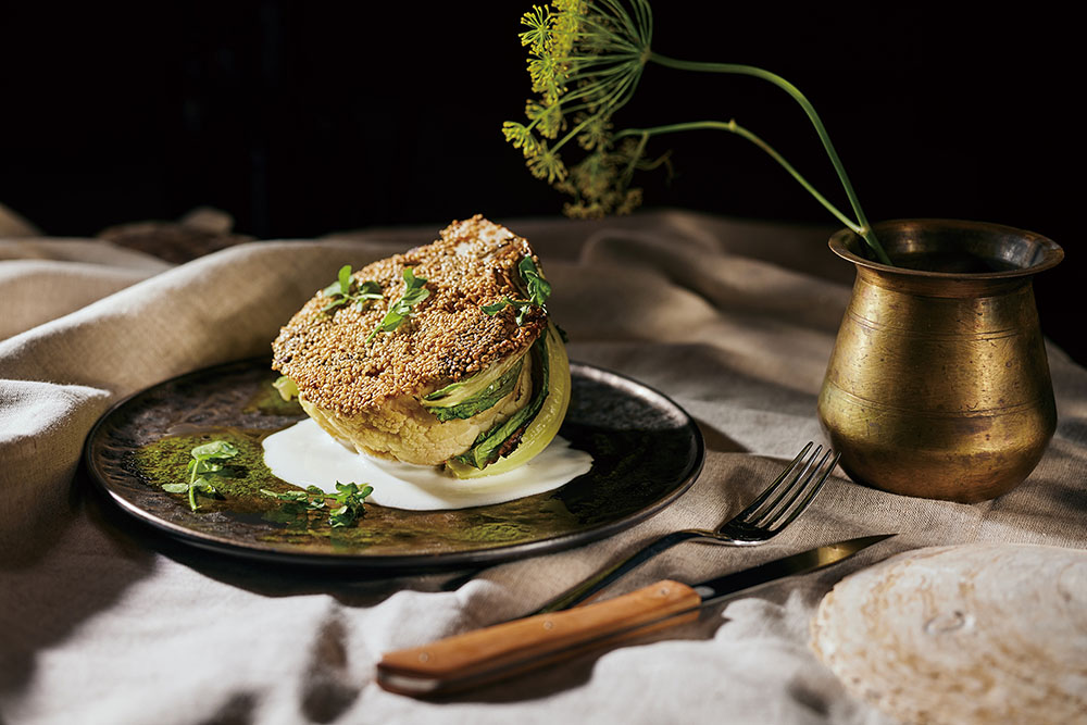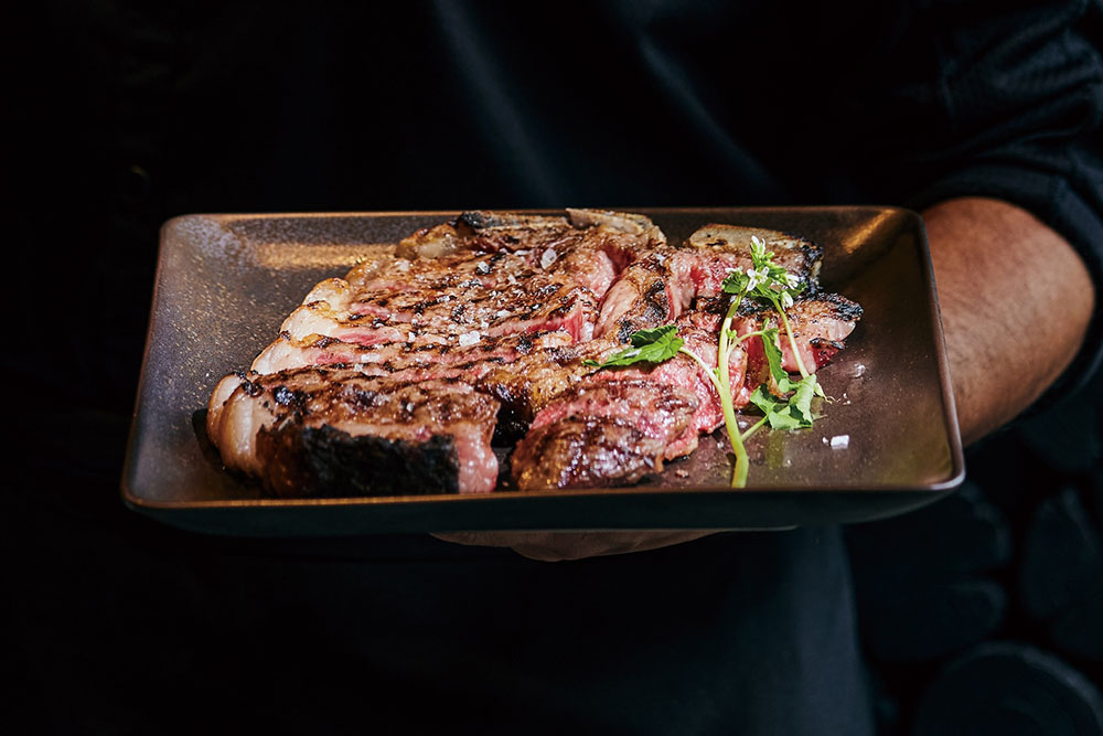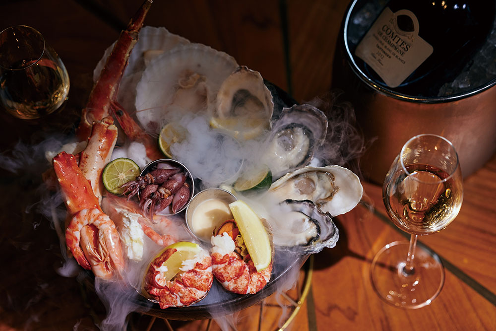 新天地・京都では、鹿児島県産黒毛和牛や熊本県産あか牛など日本が誇るブランド牛、アメリカ産プライムサーロインなどをキッチンのセラーで食べごろに熟成してから炭火焼に。新鮮な魚介を贅沢に盛り合わせたシーフードプラッター、カリフラワーを塊で炭火焼にしてミントヨーグルト胡麻ソースを添えた一皿など、日本の食材にこれまでの経験を掛け合わせたメニューで楽しませる。