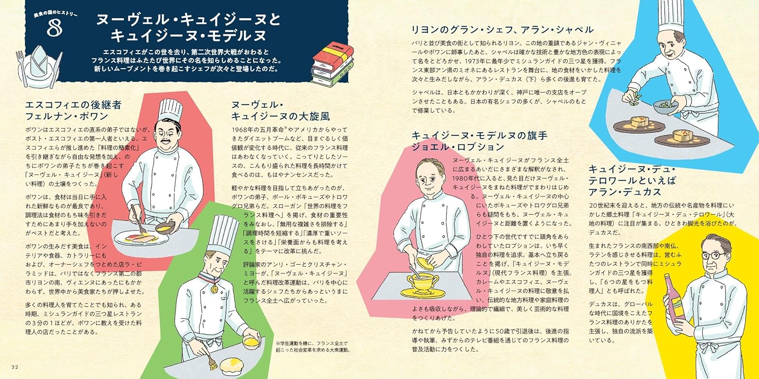 山口シェフ自身が「学び始めた頃に読みたかった」と語る本書は、フランス料理の歴史、食材、調理法、郷土料理まで、プロの知識をイラストでわかりやすく解説した入門書だ。フランスの食文化を形成してきた時間軸と地理軸、縦軸と横軸が綾なすように、フランス料理の全体像が一冊に収められ、作り手としても食べ手としても知っておきたい基礎知識が親しみやすく網羅されている。