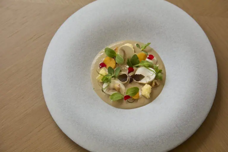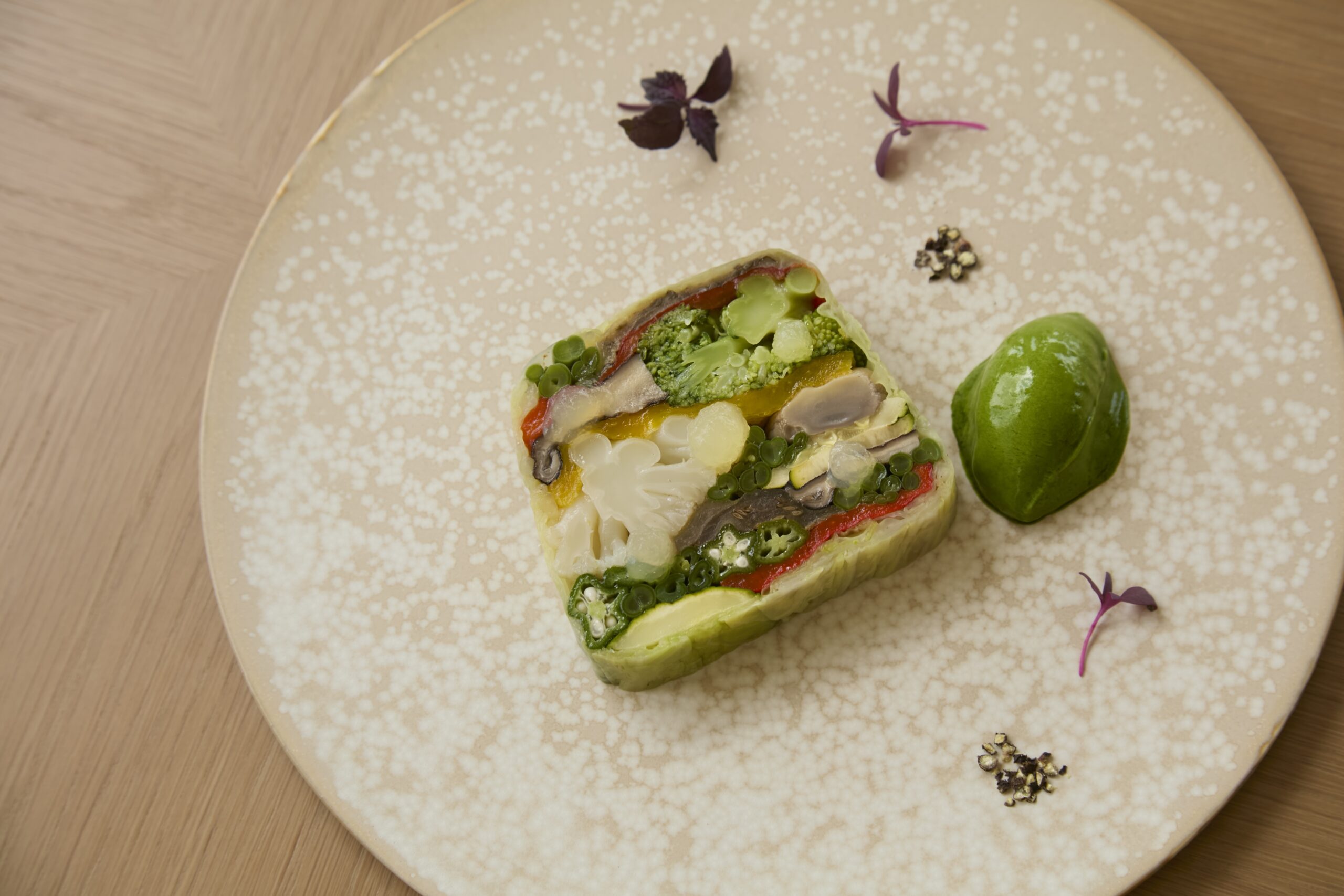 加茂健総料理長が手がける「能登 高農園 有機野菜のプレッセ」は、動物性食材を一切使用せず、素材そのものの味わいを活かした美しい一皿。デザートには、ラ・ピラミッドのシェフパティシエ川村平氏による同店のデザート「マルジョレーヌ」と「ピアノのショコラ」を現代的な技法で提供します。詳細・予約方法はお電話、または公式HPにて。