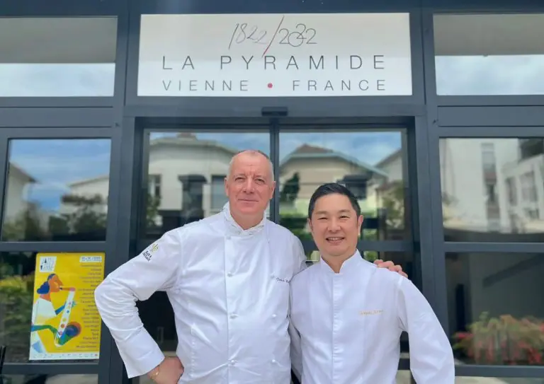「ラ・ピラミッド」オーナーシェフ、「ザ・キタノホテル東京」人材育成アドバイザー、パトリック・アンリルーシェフと「ザ・キタノホテル東京」総料理長加茂健シェフ。ザ・キタノホテル東京は2025年度のフランスのレストランガイド「LA LISTE(ラ・リスト)」にて特別賞(ホテルの新たなスタイル提案賞 Noveau Style de l’Hotel) を受賞。