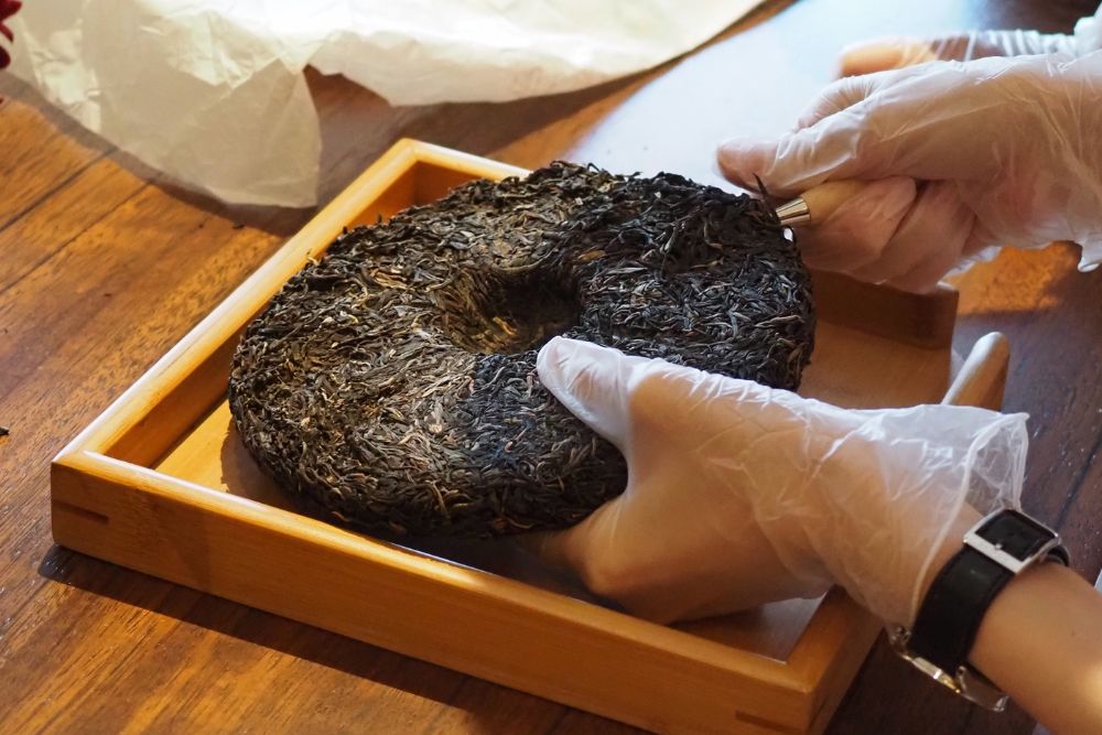 POUYUENJIのシグネチャーティーでもある生プーアル茶『金達摩|JIN DA MO』の「餅茶」を自身でほぐす体験ができる貴重な機会で、豊富な知識と秀逸な茶芸の技をもつティーマスターが、名工の技が宿る茶器でご参加の皆さまにお茶をふるまいます。