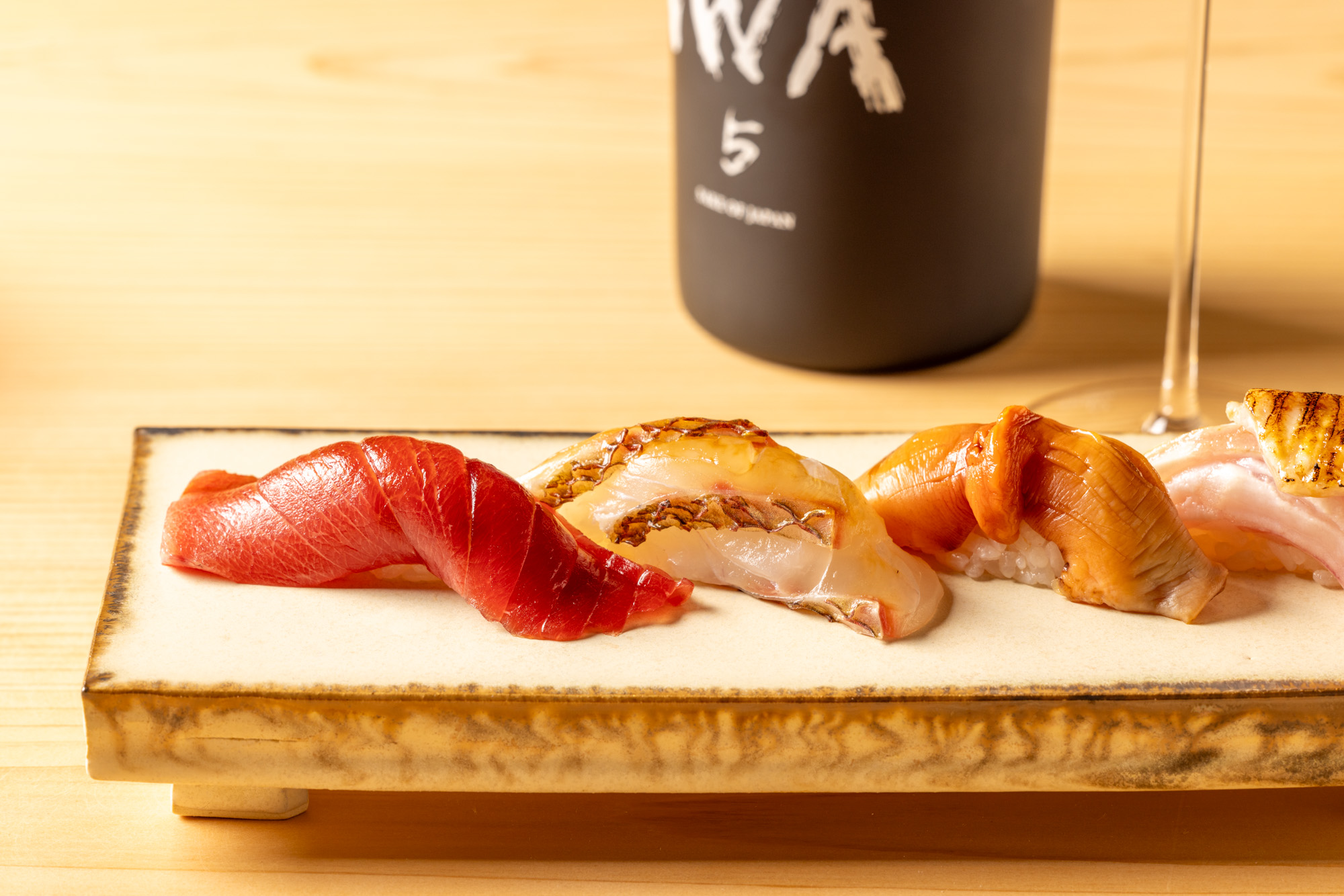 おまかせコースは、 “エモーション”と名付けられた前菜、握りやスープからなるメイン、デザートの3部構成。握りは丁寧に仕事を施した旬のネタはもちろんのこと、目の前で削った鰹節をシャリとの間に忍ばせた漬けマグロ、揚げたエシャロットとショウガを合わせた大トロ、リンゴ×ショウガのガリなど、和とフレンチが織りなすラビスならではの仕立てに。ドリンクは鮨とのペアリングをソムリエが巧みにナビゲートし、シャンパーニュ、日本酒、ワインと行き来しながら新鮮な発見も。