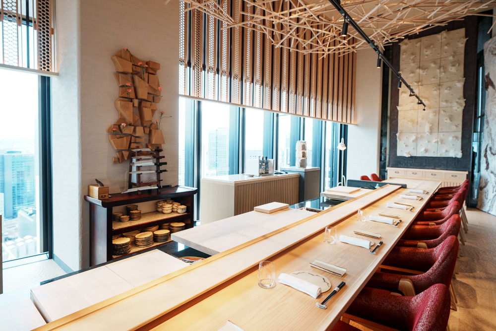 37Fの大きな窓の眼下に広がるのは、水の都といわれる大阪・堂島エリアで、カウンター越しには職人の仕事を目の前で堪能できる。