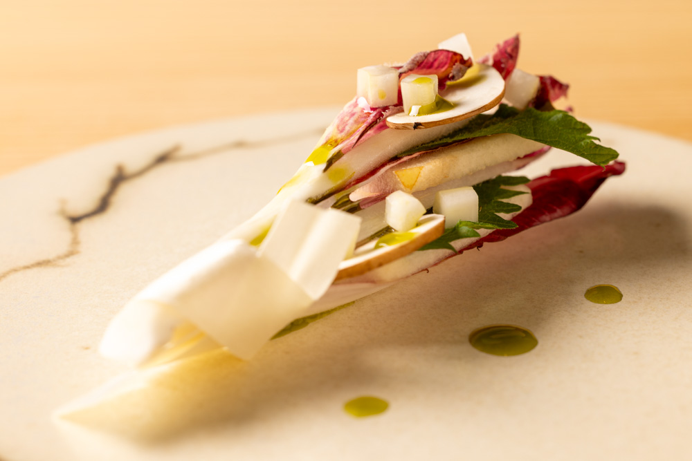 「エンダイブとトレヴィスのサラダ」。洋ナシやセロリ、マッシュルーム、大葉などを重ね、透明醤油を忍ばせた。イタリアンパセリのオイルを付けながら、手でつまんで食べる前菜の一品。