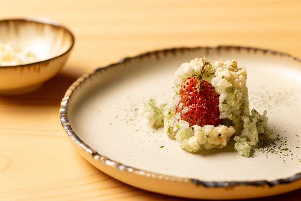 塩竃をイメージしたヤニックシェフの考案のデザート「イチゴの砂糖窯焼き、ウイキョウ」。イチゴのジューシーな甘味を閉じ込めた。