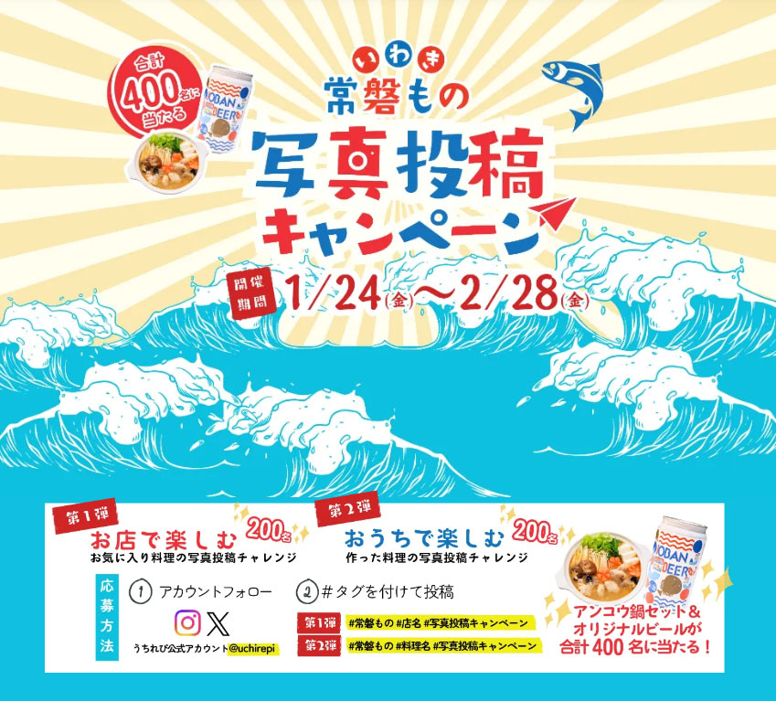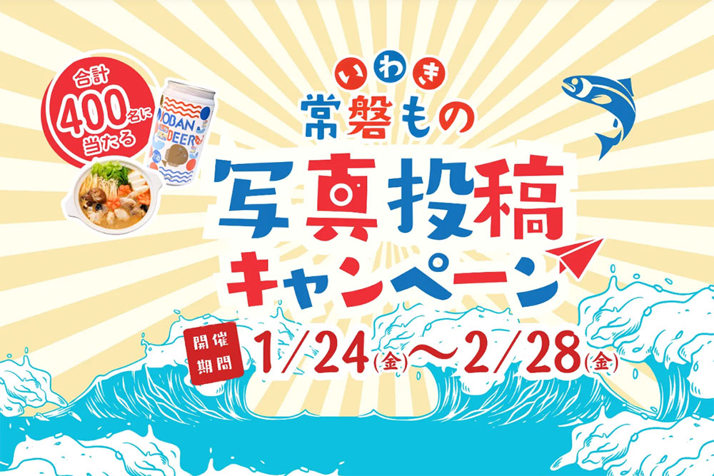 2025年2月1日(土)~2月28日(金)には首都圏の高級レストランから居酒屋チェーン、小売店が参加する「いわき常磐もの」フェアを開催。併せて、レストラン等で食べた料理や、「常磐もの」の水産物・加工品を使った料理をSNSに写真投稿すると、合計400名に冬のごちそうアンコウ鍋とオリジナルビール「JOBAN BEER」が当たるキャンペーンを実施中です。終了までラスト2日。いわきの水産物のおいしさを再発見してください。