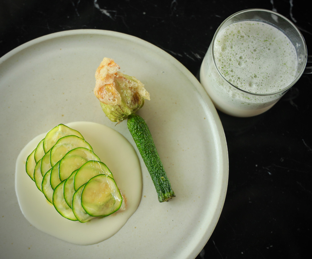 ブレンデッドウイスキーの「嘉之助DOUBLE DISTILLERY」はクリームソースとの相性が抜群。ズッキーニのスライスを貼り付け蒸した平目と、セップ茸を詰めた花ズッキーニを添え、「アーモンドミルク、牛乳とミントの泡 ×嘉之助DOUBLE DISTILLERY」のカクテルで相乗効果を生む。