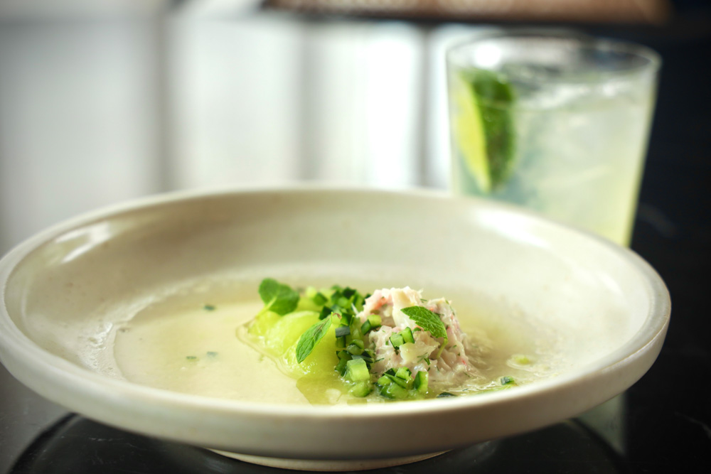 フラッグシップの「シングルモルト嘉之助」は生のトマトとの相性がよかったからと、トマトのクラリフェとメロンの冷たいスープ仕立てにズワイ蟹を合わせ、「ペルノー ライム×シングルモルト嘉之助」のカクテルで爽やかにスタート(Top画像)。