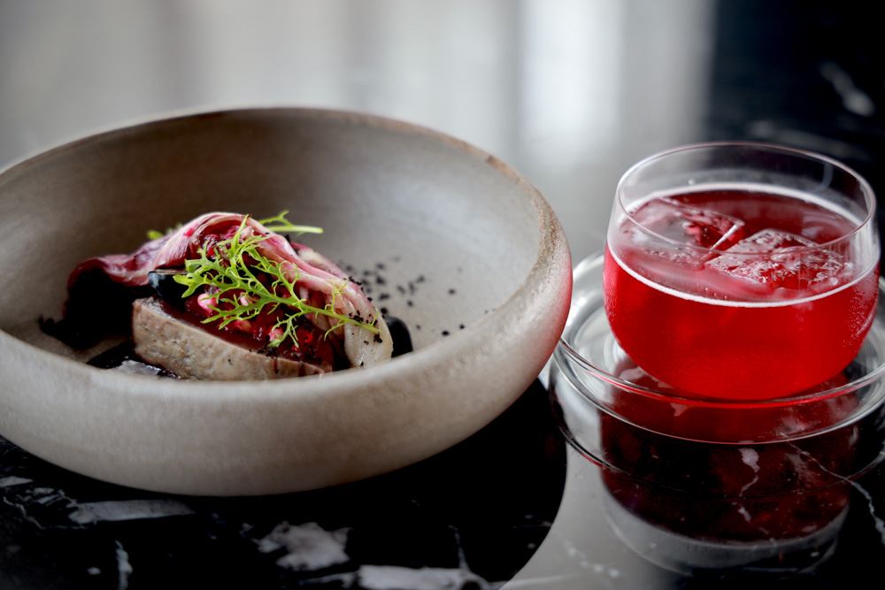 鰹の燻製とビーツの風味にピート香が合うと、「嘉之助シングルモルト PEATED」はブルーベリーワイン(デラウェア) 、黒文字茶、アールグレイのカクテル仕立てに。