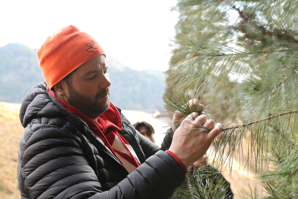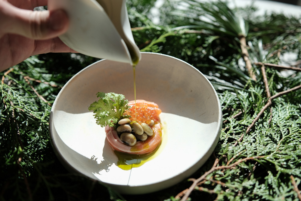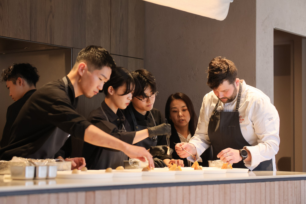 2月の山の恵みは春や秋に比べると限られるが、針葉樹を中心にモミの木や葉っぱ、カヤノミやモクレンの蕾などから巧みに森の香りを抽出。地元の食材と掛け合わせて「森を食べる」コースを仕立てていく。その様子を「想像した以上に即興で料理を作ることに驚いた」と話す若手料理人たち。