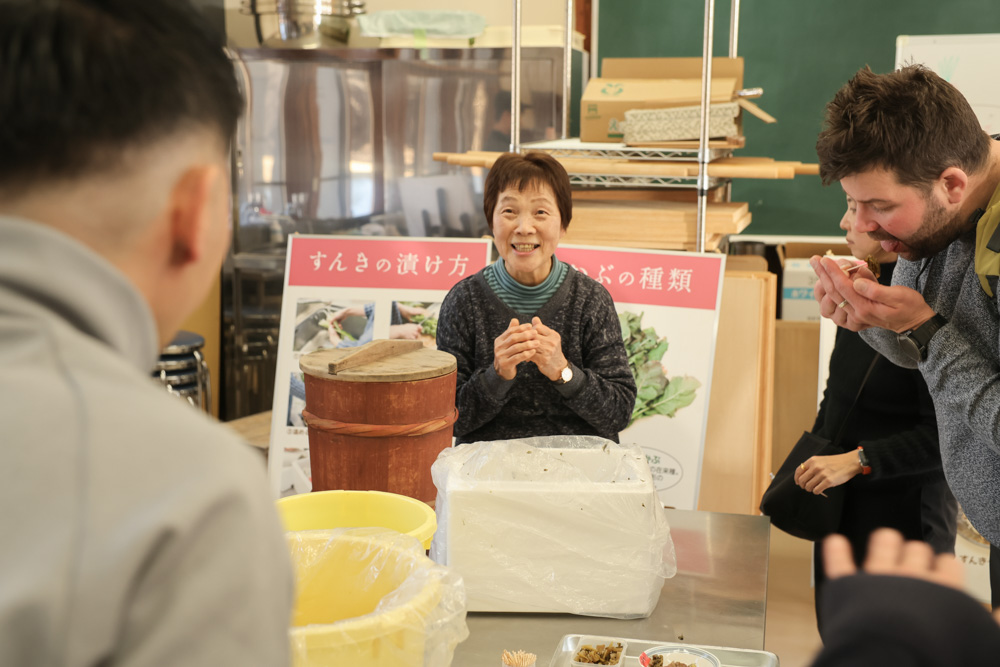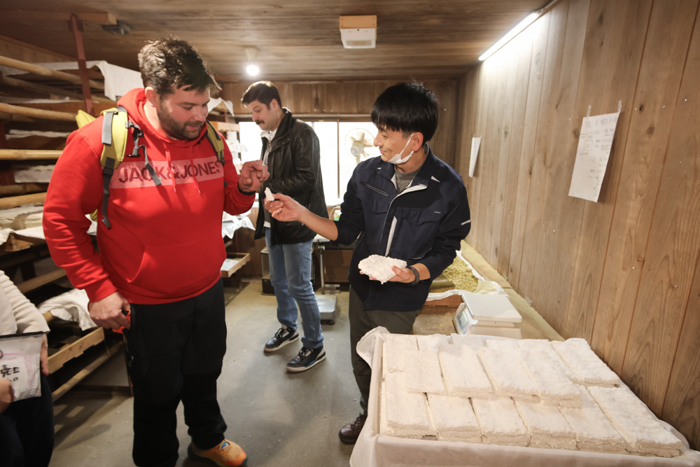 スロヴェニアでも糀を取り寄せ、独学で味噌や醤油を仕込んでいるルーカシェフが、今回一番楽しみにしていたのが糀屋訪問。温度管理や使っている道具など質問攻めにしながら「自分たちは手をかけすぎているかもしれない」と、そこに棲みつく菌に委ねる日本の発酵文化への気づきがあったようだ。