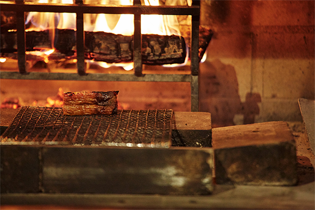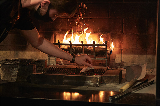 その炉は、手前が熾火を敷く床になっていて、奥に薪を燃やす鉄籠が据えられている。勢いよく燃え上がる炎で焼くのも、じんわり穏やかな熱でゆっくり火を入れていくのも、料理人次第。