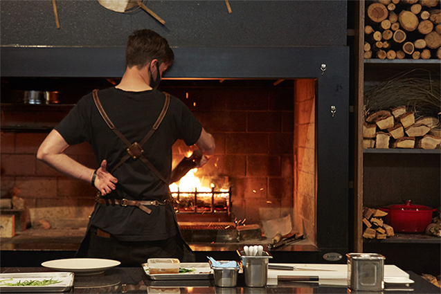 「松本十帖」の総料理長に就任して、炉の熱源を炭にするか薪にするかの選択を求められた時、クリスは迷わず薪を選んだ。理由は「香り」。薪で焼くと木の香りを料理にかぶせることができるからだ。「木の種類によっては酸味が付加されることもある」とクリス。薪の香りは調味料にもなる。
