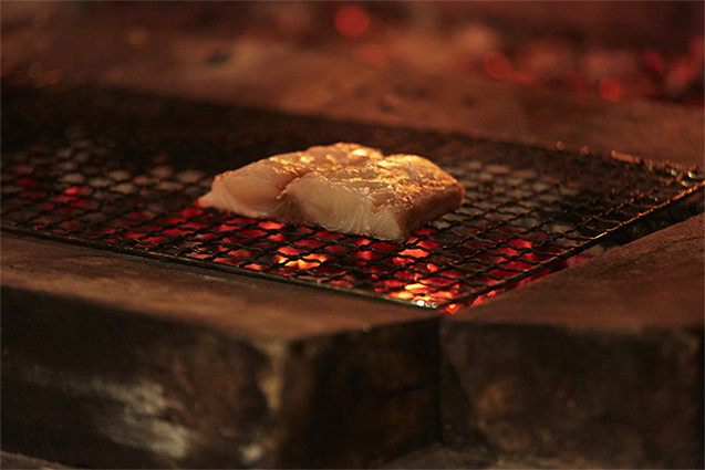 佐渡沖で揚がったサワラは丸ごと1週間熟成させて旨味を引き出す。切り身にして熾火でじっくり火を入れる。