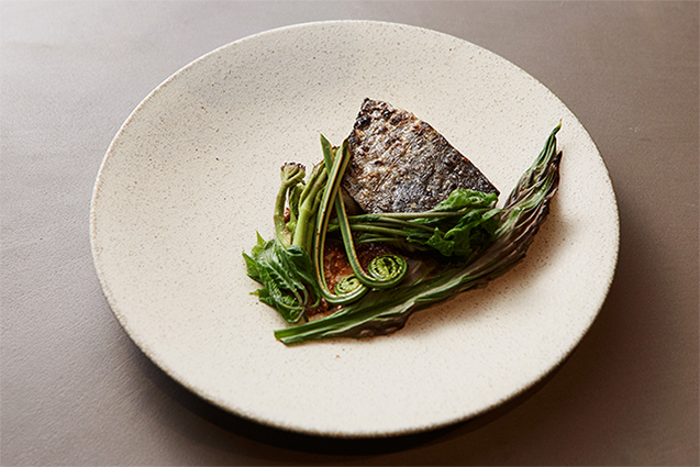 サワラに合わせるのは、長野県佐久市の山で採れた山菜。松本にある「大久保醸造」の味噌で仕込んだ蕗味噌と新潟のかんずりで作るソースを添えて。