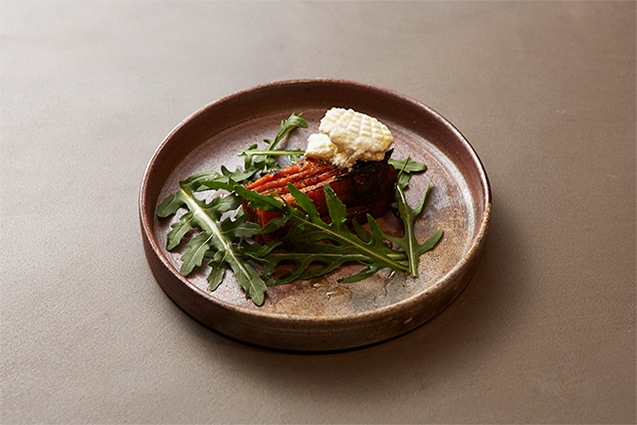 「ニンジンのミルフィーユ」。ニンジンをオーブンで丸ごと焼いた後に、皮と芯に分け、芯はピュレにして、ニンニク、ショウガ、タイム、セージ、醤油と合わせる。皮を重ね、間にピュレを挟み、薪火で炙る。「清水牧場」のフレッシュチーズ、ルーコラを添えて。