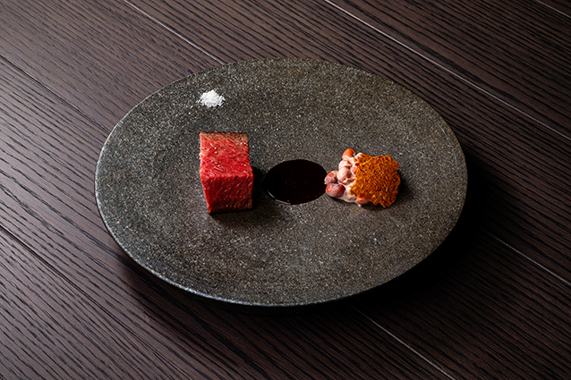 鳥山牧場の赤城和牛を使ったひと皿。大豆と味噌で作る付け合わせを添えて。