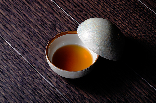 シグニチャーディッシュのコンソメ。赤城和牛のスネ肉や自店時代から懇意にしてきた農園の野菜で作る。