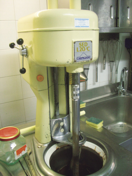 イタリアでの修業時代に使っていた、カルピジャーニのジェラートマシン。現在は生産終了となっている古い機械で、仕上がりを自分の目で見極めねばならないため、勉強になった。