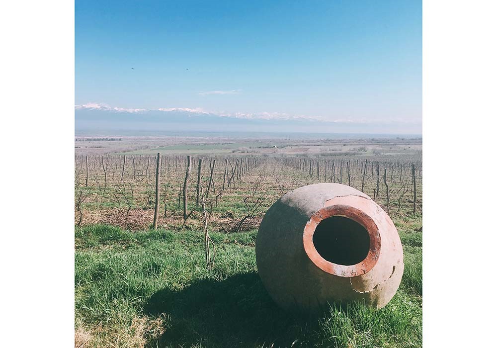 フェザンツ・ティアーズのブドウ畑。ジョージア東部のワイン産地カヘティ地方にある。研究のため、400種以上のブドウ品種を植えている。手前に見えるのがクヴェヴリ。