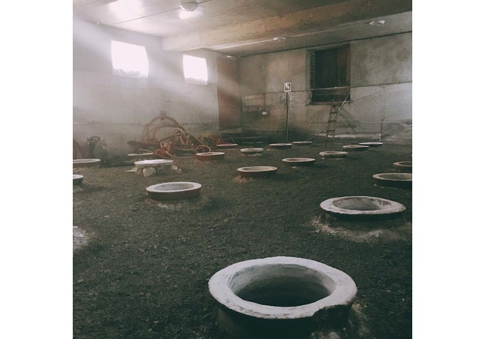 土に埋められたクヴェヴリ。ブドウを収穫、破砕の後に投入される。「密封して放置するケースと途中で櫂入れするケースもありますね」と高橋さん。