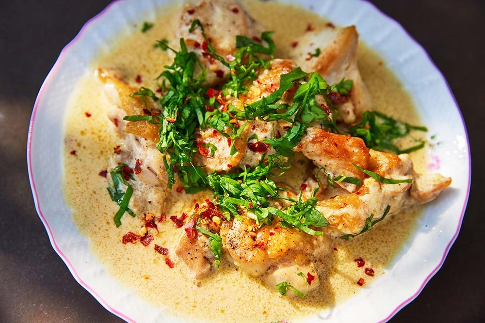 日本でもブームになったシュクメルリ。鶏肉を炒めてサワークリームで煮た料理で、「ごはんにかけて食べるとおいしいのよ」と岡崎さん。
