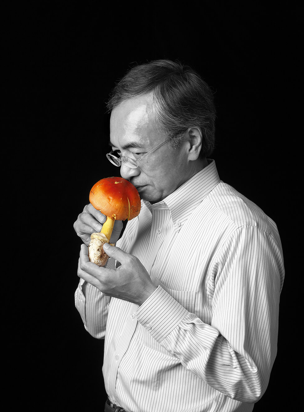 写真で手にしているのは、この10年、向き合い続けている森に生えたタマゴ茸。