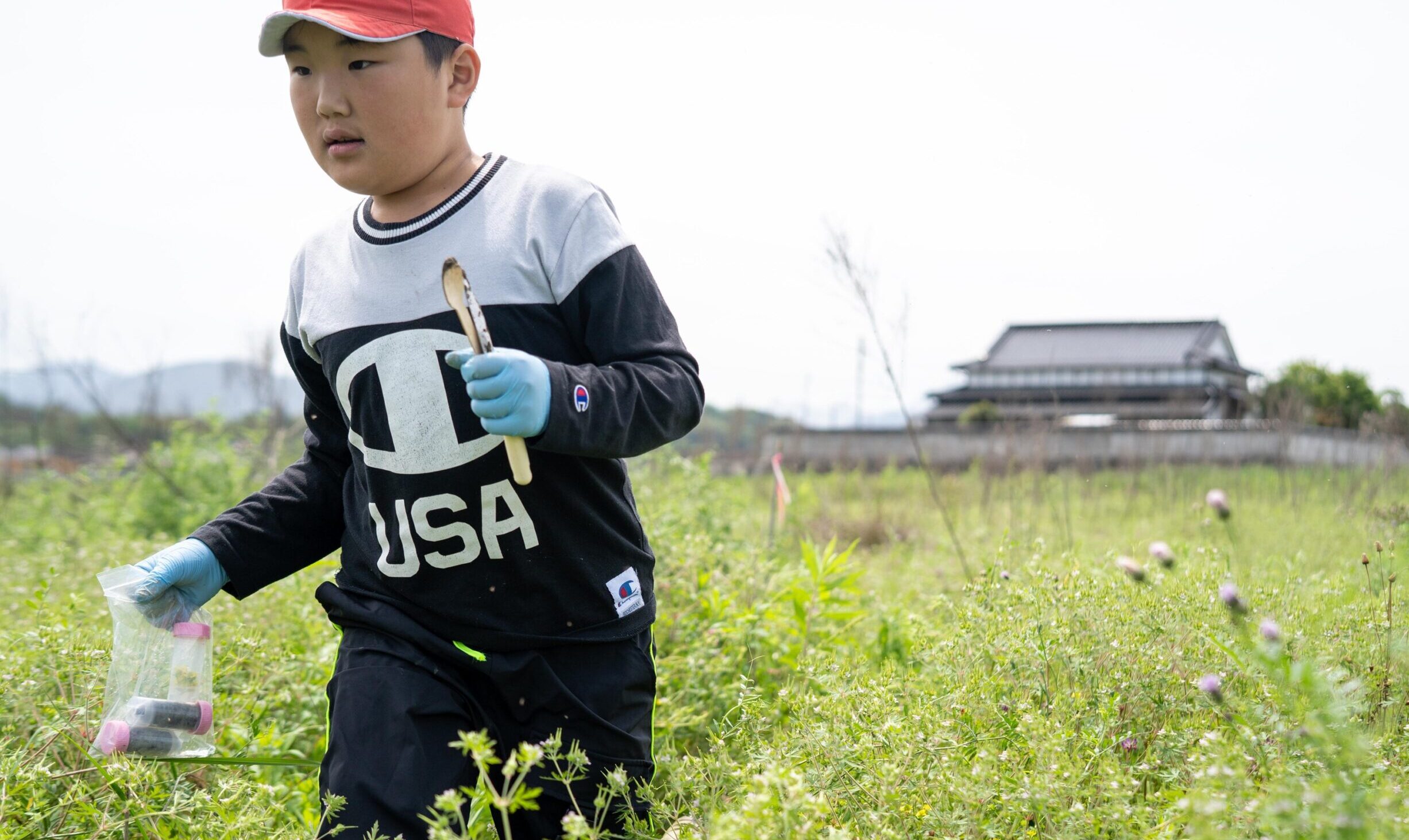 校庭の次は建設予定地である野原に移動。教室で講義を聴いていたときは眠そうな子も、打って変わって生き生きした表情を見せる。花や草や虫や土が感性を刺激し、遊び道具になるようだ。子供たちに試験管を渡すと、たちまちいろんなところに飛んで、様々なものが集まった。その数約80。