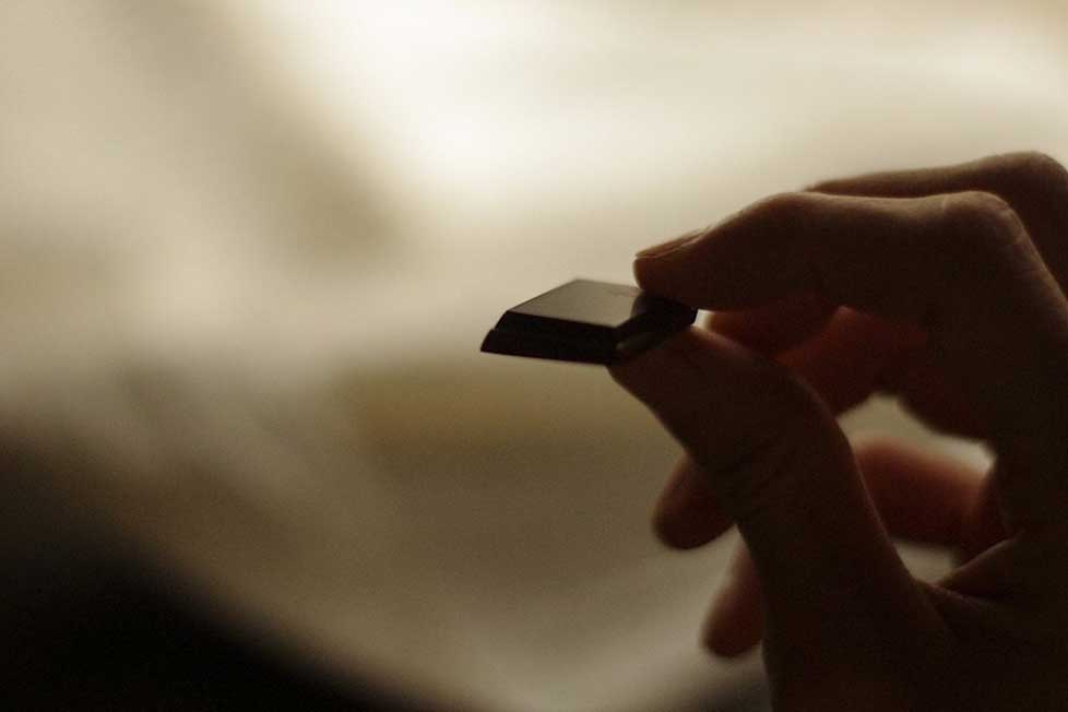 無垢チョコレートは油脂(ココアバター)が主成分。口に含むと、まずは油脂が融け、そこに含まれている香り成分が放出される。その後、唾液と混ざり乳化して、水に溶ける香り成分がたってくる。その点、口に含んでからの香りの移ろいが顕著なのも、無垢チョコレートの特徴だろう。そのまま食べてもいいが、色気のある嗜好品と合わせたい。うまく合わせると、相乗効果でお互いの印象をさらに引きたてることができ、それが飲み物と合わせる魅力だ。