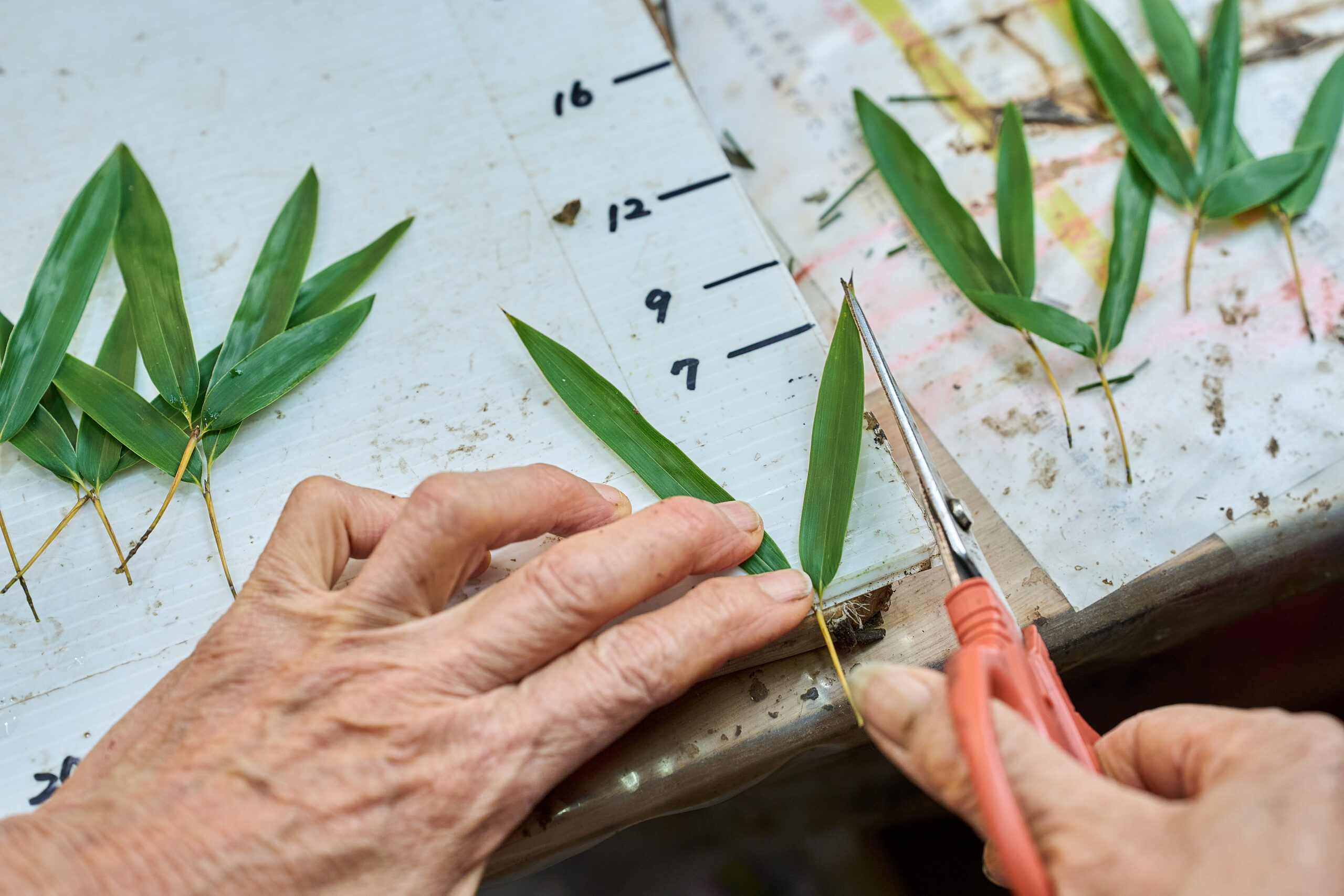 例えば古い葉を全部取って、新しい葉を出すために行う「葉むしり」も、いつやるかが大事。通年出荷する南天や青もみじに加えて、桜や梅、赤もみじや柊など、季節ものの商品もある。それぞれの出荷時期にベストな状態で出せるように、逆算して手入れするのが大切なんよ。